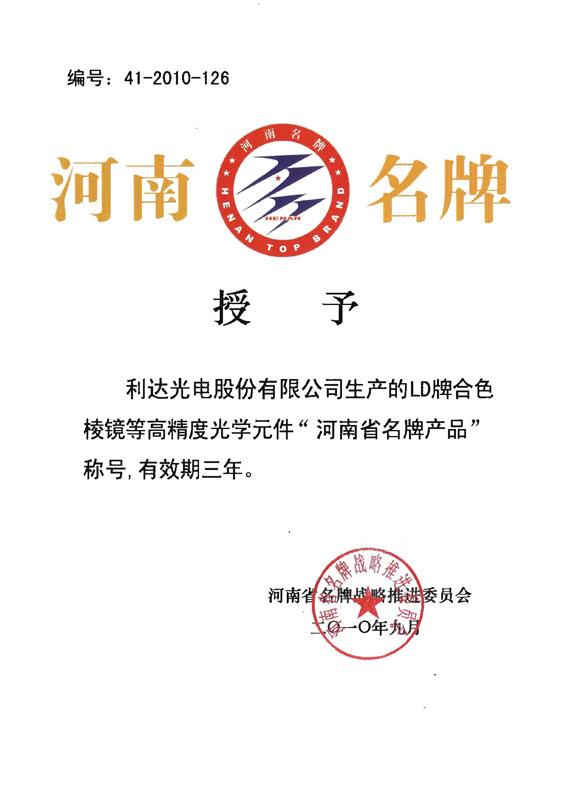 利達光電“LD”牌高精度光學元件榮獲河南省名牌產(chǎn)品